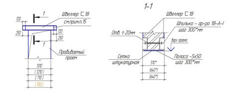 швеллеры шпильками из арматуры (марки 18-А –I с шагом 300 мм); все зазоры между