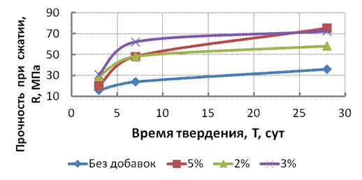 прочность в возрасте 28 суток имеют образцы с добавками в количестве 3 и 5 %. При этом видно, что
