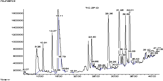 Содержание органических и жирных кислот в траве астры ромашковидной определяли хромато – масс - спектрометрическим методом. Определение проводили с помощью хроматографа Agilent Technologies 6890 с масс - спектрометрическим детектором 5973. Хроматографическая колонка – капиллярная DB-5 с внутренним диаметром 0,25 мм и 30 м длиной. Скорость введения пробы - 1,2 мл/мин. Температура нагревателя - 250ºС. Температура термостата - запрограммирована от 50ºС до 320ºС со скоростью 4º/мин. Для идентификации компонентов использовали библиотеку масс-спектров NIST 05 и WILEY 2007 c общим количеством спектров более чем 470000, а также программы для идентификации AMDIS и NIST. Для количественных расчётов использовали метод внутреннего стандарта.