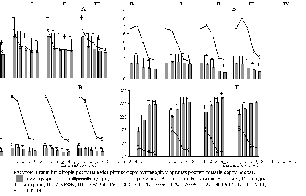 редукуючих цукрів у стеблах томатів оброблених EW-250 зменшувався на 26%, а сахарози на 20%. За дії ССС-750