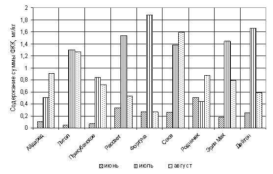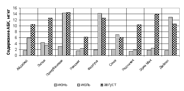 2011 (июль) и 2012 гг. (июнь) составило у сортов Лигол (3,93 и 2,1 мг/г,
