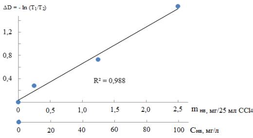 За попередньо побудованому градуйованому графіку ΔD=f(mн), представленому на рис. 2, визначали практичний вміст (mнв, мг; Снв,