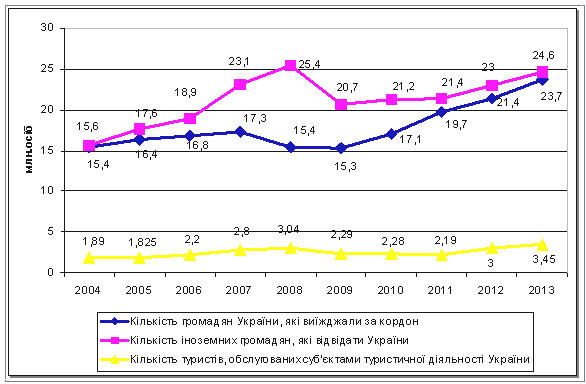 Рис. 1. Розвиток туристичної галузі України у 2004-2013 роках.