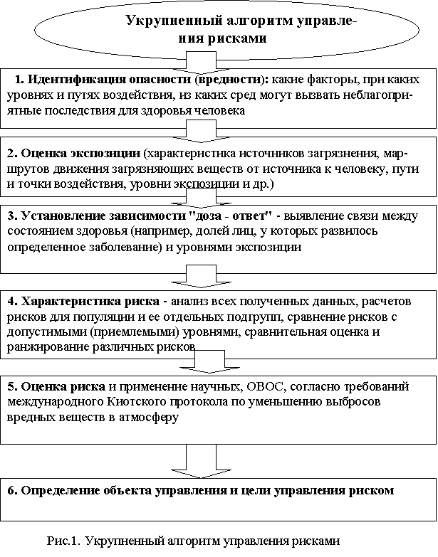 взаимодействия между организмом человека и факторами окружающей среды и оценками рисков на здоровье населения. Предложен укрупненный алгоритм структуры управления рисками.