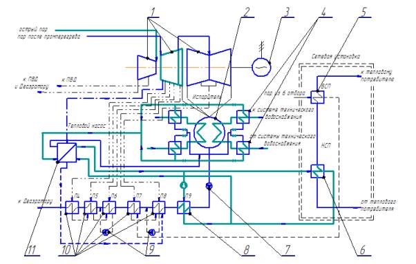насосы; 10 – группа подогревателей низкого давления; 11 – абсорбционный бромисто-литиевый