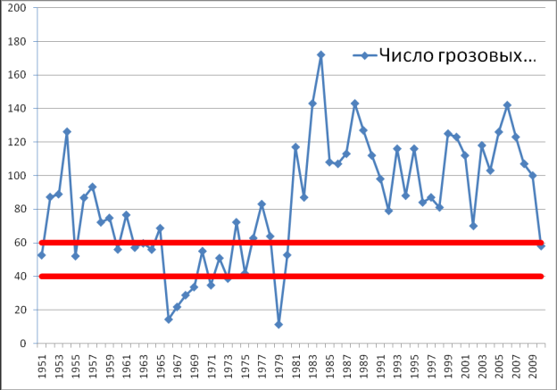 разрядов молний в год от 40 до 80 часов. Обработка многолетних наблюдений за грозовой деятельностю