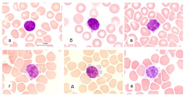 Лимфоциты с относительно гладкой поверхностью (а), с тонкими нитевидными структурами (б), с выростами и со сфероидными образованиями (в-е). Окраска по Паппенгейму. Масляная иммерсия, об. 100, ок. 10.