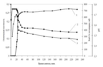 Red-Ox-потенциала(2) и рН(3) от времени синтеза