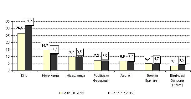 припадає понад 82% загального обсягу прямих інвестицій, входять: Кіпр –