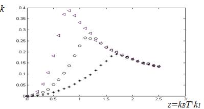 значениях параметра анизотропии = 1(o), 0,5 (*), 0,2(<)