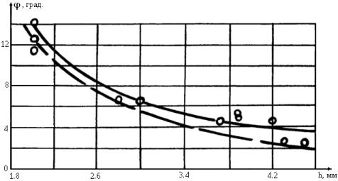 Л.А.Горшковым проведена серия экспериментов над закрученными образцами прямоугольного сечения из стеклопластика и углепластика с различными вариантами укладки слоев. Образцы шириной 40 мм., длиной 100 мм. и углом закрутки 30° при различных толщинах подвергали растяжению. Варьируя толщину образцов, была по­лучена экспериментальная зависимость угла упругой раскрутки от толщины h (рис. 2). В связи с близостью значений углов раскрутки различных образцов на рис. 2 приведена экспериментальная кривая только для стеклоткани, расположенной основой вдоль оси образца. На этом же рисунки приведена теоретическая кривая, рассчитанная по формуле (15) [1]. Упругие константы стеклоткани и стеклопластика ТЖС-0.7 близки и поэтому справедливо утверждение, что экспериментальные точки ложатся довольно близко к расчетным кривым.
