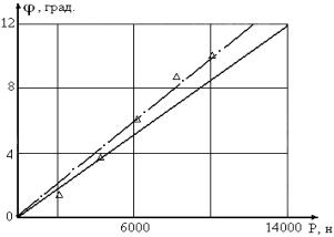 Рис 3. Сравнение расчетных (сплошная линия) значений угла раскрутки для однонаправленных образцов прямоугольного сечения из углепластика с экспериментальной кривой в зависимости от нагрузки. Пунктирная линия - кривая, построенная по  экспериментальным точкам ().