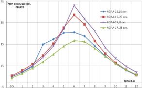 данных построены зависимости угла возвышения от времени пролета спутника и