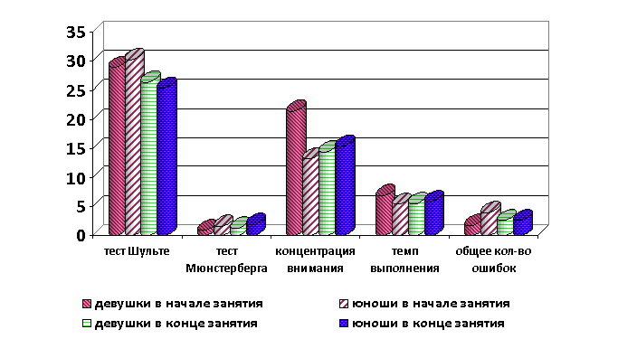внимания. Снижения показателей к концу занятия были одинаковыми у девушек и