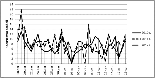 2012 году. Наибольшее количество особей было отловлено 19.08 (13 птиц).