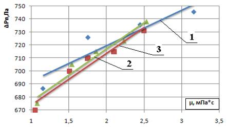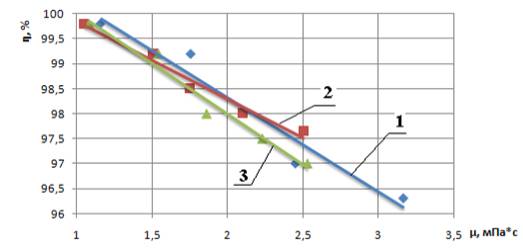 вязкости шлама: 1 – мучная пыль; 2 – подсырная сыворотка; 3 – кормовые дрожжи.
