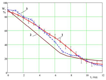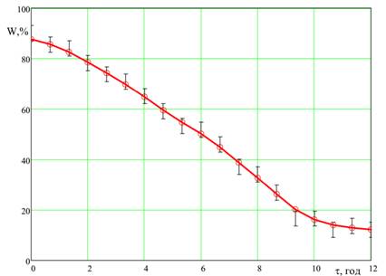 отримано криву сушіння, подану на рис. 1, яка описує зміну відносної вологості