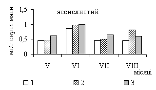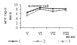 максимального значення (23,32 мг/г сирої маси) в фазу вторинного росту (липень)