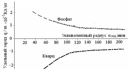 Рисунок - Зависимость удельного трибозаряда частиц фосфата и кварца на