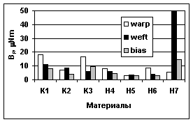 результаты можно объяснить большой разницей характеристики ВF этих тканей по основе и утку.