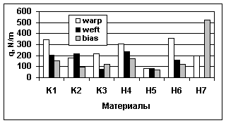 в диагональном направлении ткани K3 на 37.2% выше, чем в направлении утка, а у ткани H7 превышает 2,6 чем в направлении основы. Такие