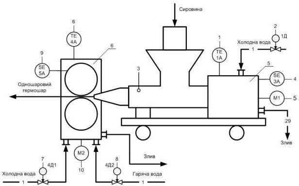 в екструдері обрали такі засоби автоматизації: поз. 2А – вимірювальний тензоперетворювач
