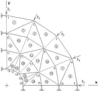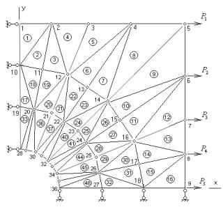 плоский элемент конструкции на конечные элементы треугольной формы и производим