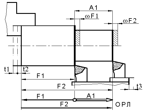 торця на величини t1,t2. Таке ж синхронне зміщення в одному і тому ж напрямку, внаслідок