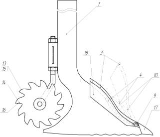 почвы (рисунок 2), включающий стойку 1 и закрепленную на ней плоскорежущую лапу