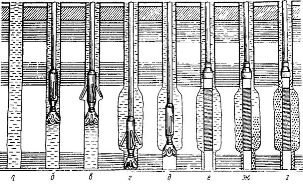 – расширение; д – подъем расширителя; е – спуск фильтрового каркаса; ж, з –