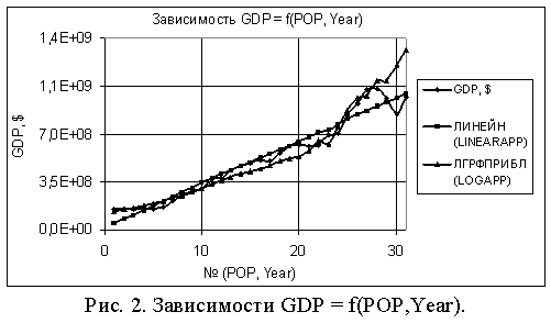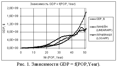 ЛИНЕЙН и ЛРГФПРИБЛ, которые входят в программное обеспечение MS Excel. На рис. 1 показан построенный график зависимости GDP =f(PОР, Year), из которого видно, что расчетная кривая, построенная с использованием