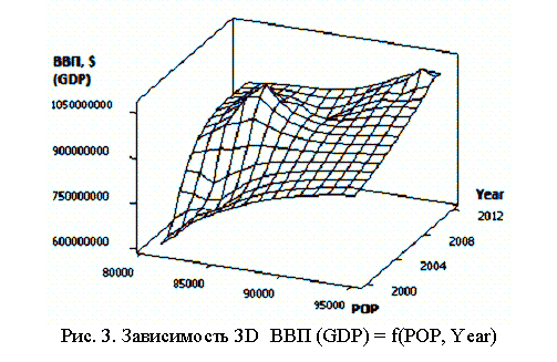 На последнем рис. 3 представлен 3D график ВВП (GDP) = f(PОР, Year), который