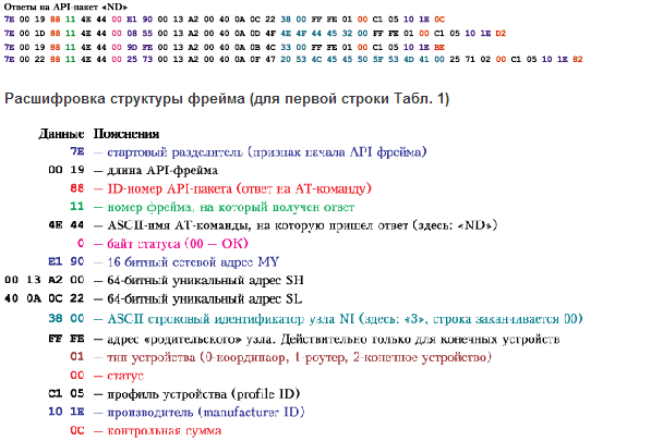 полученные на выходе UART модуля XBee ZNet 2.5, с которого был отправлен запрос на обнаружение всех