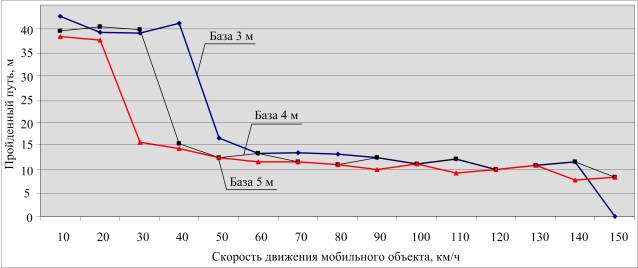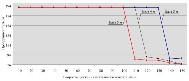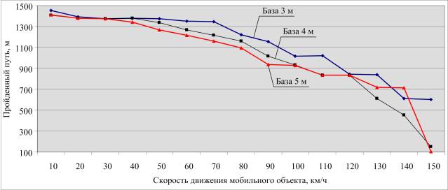 представлены графики пройденного пути в зависимости от базы и скорости движения