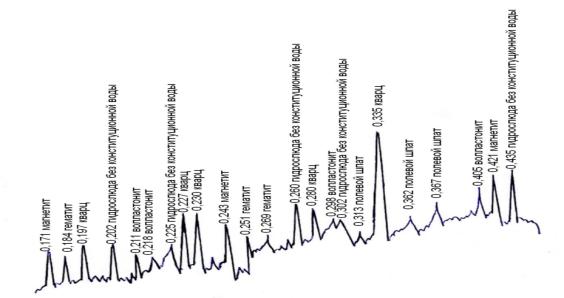 0,302 и 0,436 нм) гидрослюдой без конституционной воды, линии (d/n= 0,211; 0,218; 0,298 и 0,405 нм) волластонитом, а линии (d/n = 0,313; 0,362 и 0,67 нм) полевым шпатом.