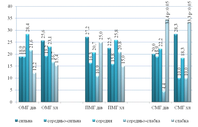 нервовою системою серед ОМГ була найменшою – 12,20–15,38%, тоді як зі сильною і