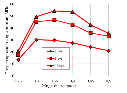 формовочных масс рационального состава исследовано влияние отношения «жидкое : твердое» на твердение композиций