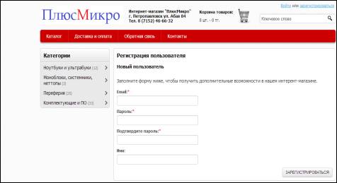 Пользователю доступна регистрация в интернет магазине. В соответствии с