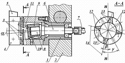 прорезной пружины, b - угол между осью перемычек и нормалью n-n к обрабатываемой поверхности, g - угол между перемычками первого и второго рядов прорезей