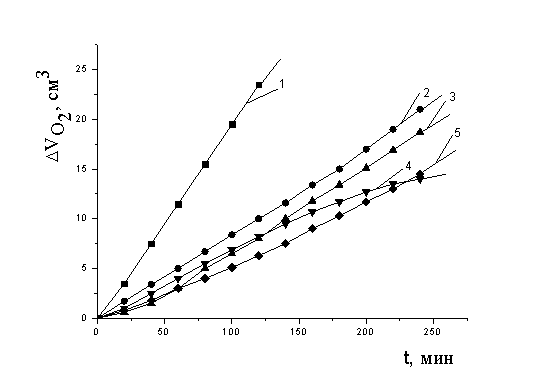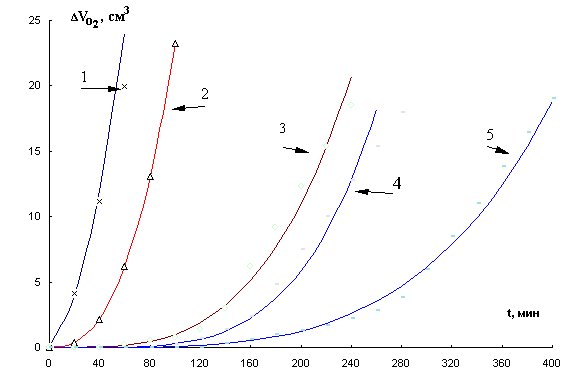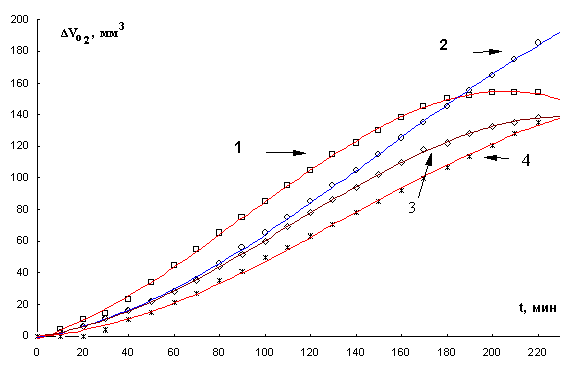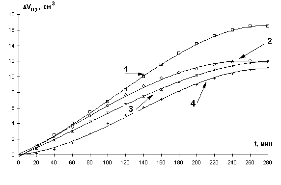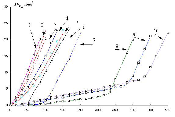 общий объем пробы 4 мл [6]. Кинетику поглощения кислорода в безводной среде
