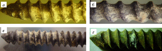 вид стальных чрескостных имплантатов после испытания in vivo: а, б, в, г
