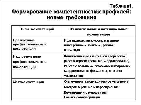 табл.1., помимо предметных выделены надпредметные профессиональные компетенции