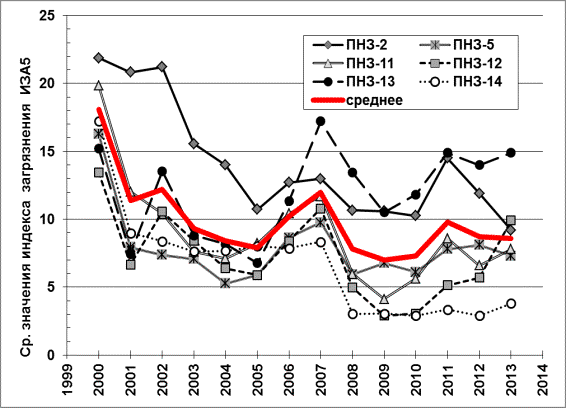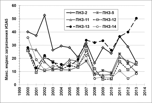 наибольший ИЗА5 наблюдается на ПНЗ-13. Таким образом, несмотря на