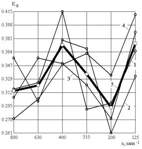 4 – Sпр=0,14 мм/об; 5 – усредненная кривая по четырем подачам