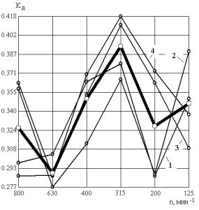 разброс форм кривых 1-4, отражающих влияние частоты вращения шпинделя на Kд при изменении продольной подачи от 0,07 до 0,14 мм/об, то при глубине