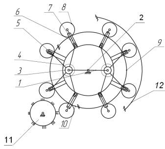 вокруг стойки 2 приводятся в движение ползуны 5, которые перемещаясь по оси
