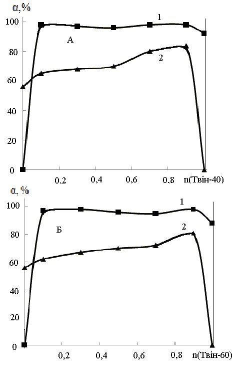 Твіну-40 (1, А), Твіну-60 (1, Б) і додецилсульфату натрію (2, А, Б) із бінарних