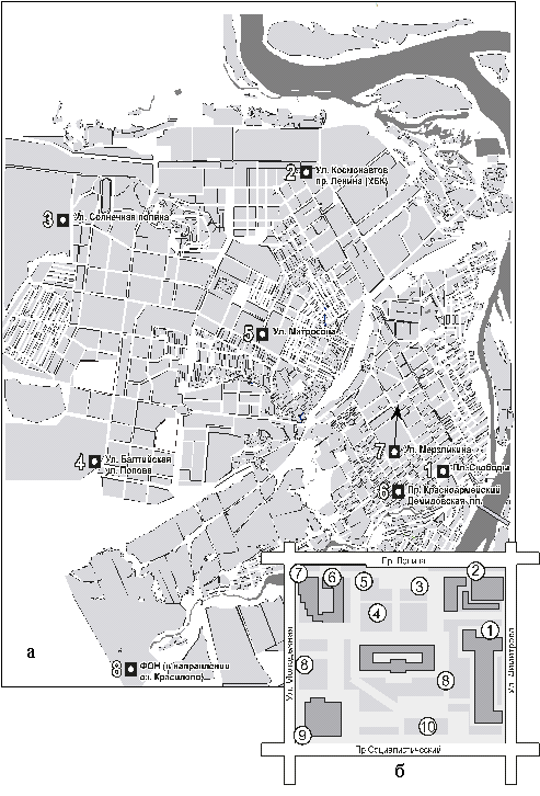 Рис.1. Опорные пункты забора проб на территории г. Барнаула (а) и точки