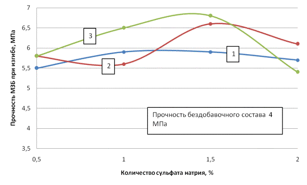 прочности на изгиб во всех трех случаях при дозировке сульфата натрия 1,5%