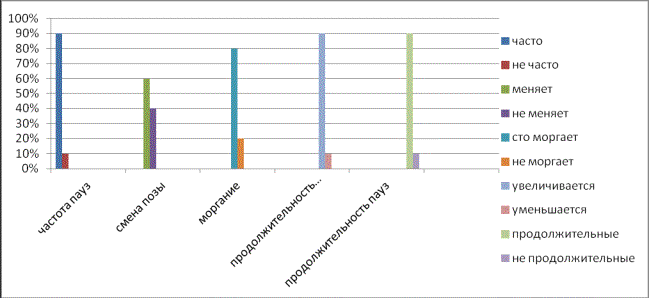 смена позы меняет – 60%, не меняет – 40%, моргание: часто моргает – 80%, не моргает – 20%, продолжительность молчания